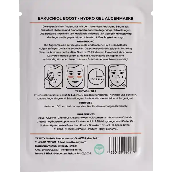 Apply the eye masks to cleansed, dry skin below the eyes and press gently. Point the narrow ends toward the nose, the wider ends outward. Remove after approximately 20-25 minutes. Gently pat the remaining serum into the eye area and allow it to absorb completely.